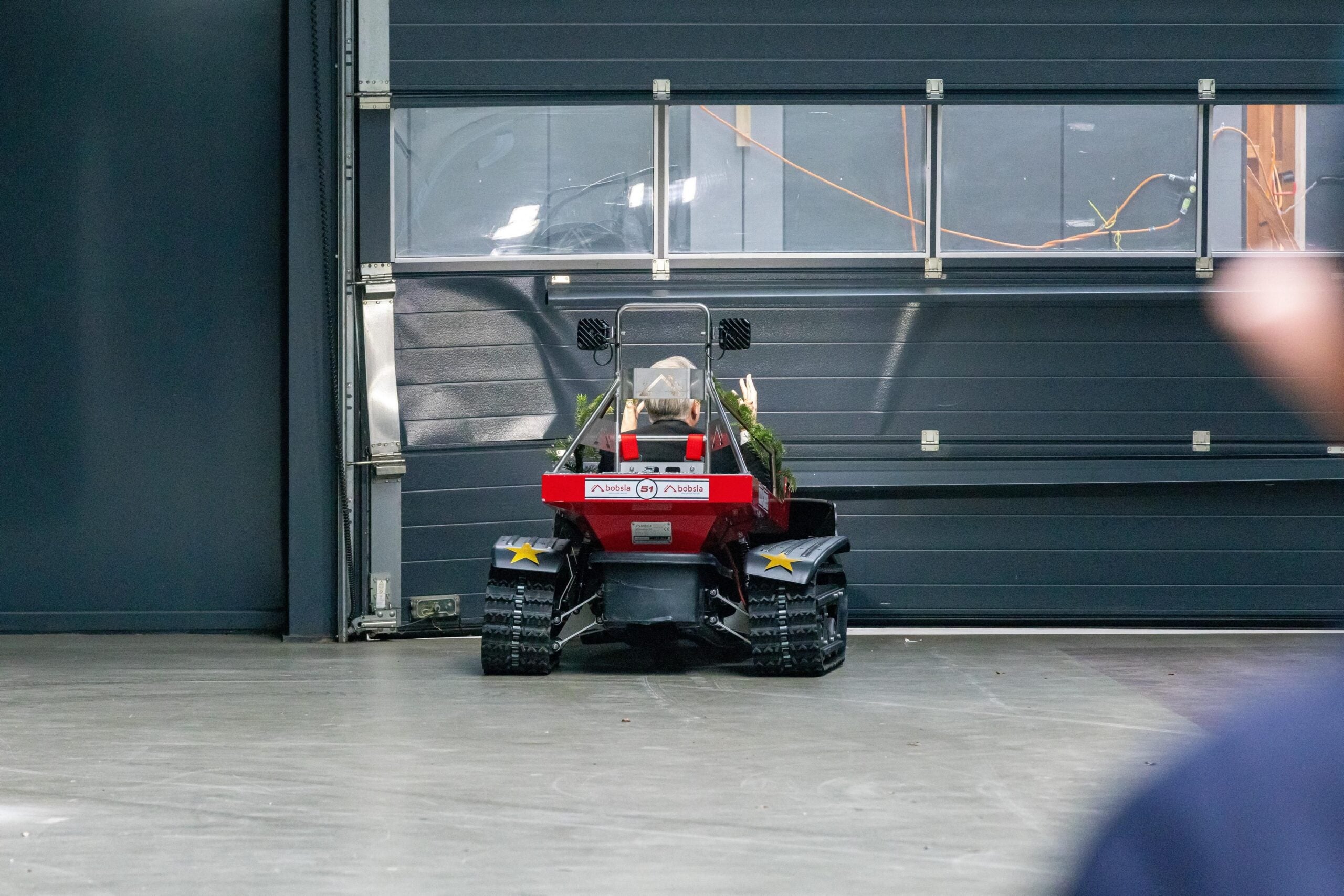 Plötzlich gab dann Frank Thelen auf kurzer Strecke Gas und rauschte ungebremst in ein geschlossenes Tor des TV-Studios und stoppte ganz plötzlich. „Bei Frank Thelen gibt es nur ein Gas und das ist Vollgas“, kommentieren Judith Williams und Crush.