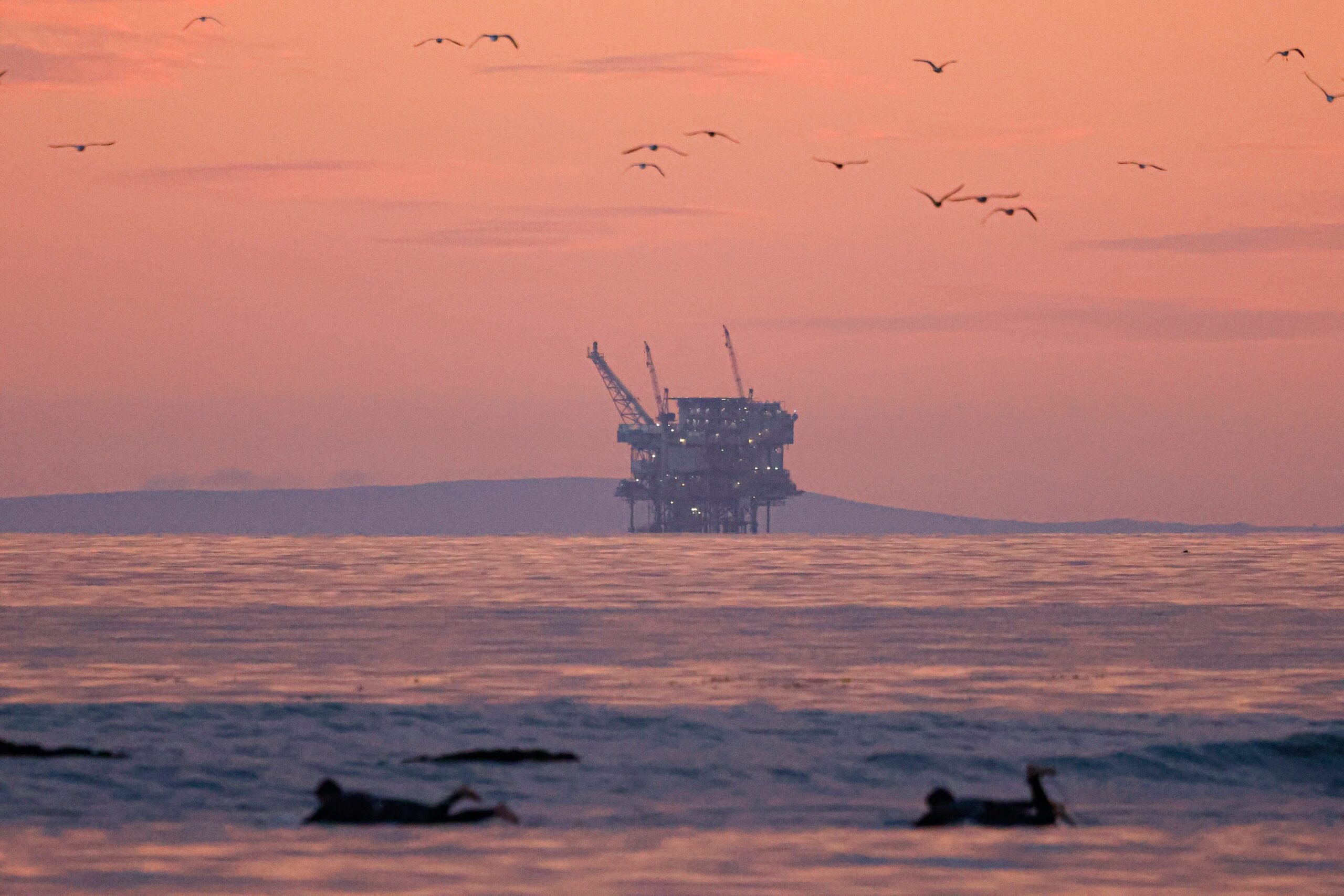 Surfer reiten vor der Offshore-Ölplattform Hondo am Refugio State Beach in Santa Barbara in Kalifornien auf den Wellen.