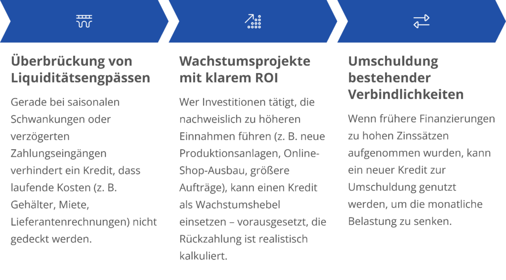 Wenn das Geschäftsmodell steht, erste Kunden vorhanden sind und das Unternehmen durch den Aufbau eines Teams, Investitionen in Technik oder Marketing skalieren will, hilft ein Kredit dabei, die dafür notwendigen Mittel zu bekommen. Weiterhin existieren drei andere Situationen, in denen ein Kredit die richtige Wahl sein kann: