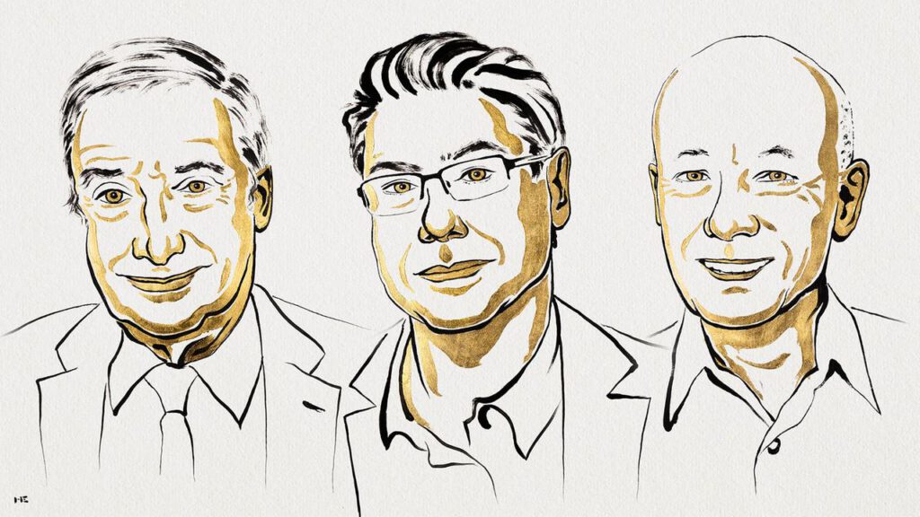 Eine Zeichnung von Joel Mokyr, Philippe Aghion und Peter Howitt