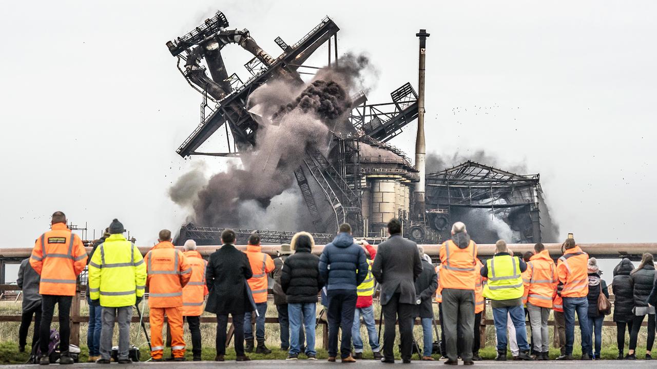 Menschen schauen zu, wie der Hochofen von Redcar gesprengt wird.