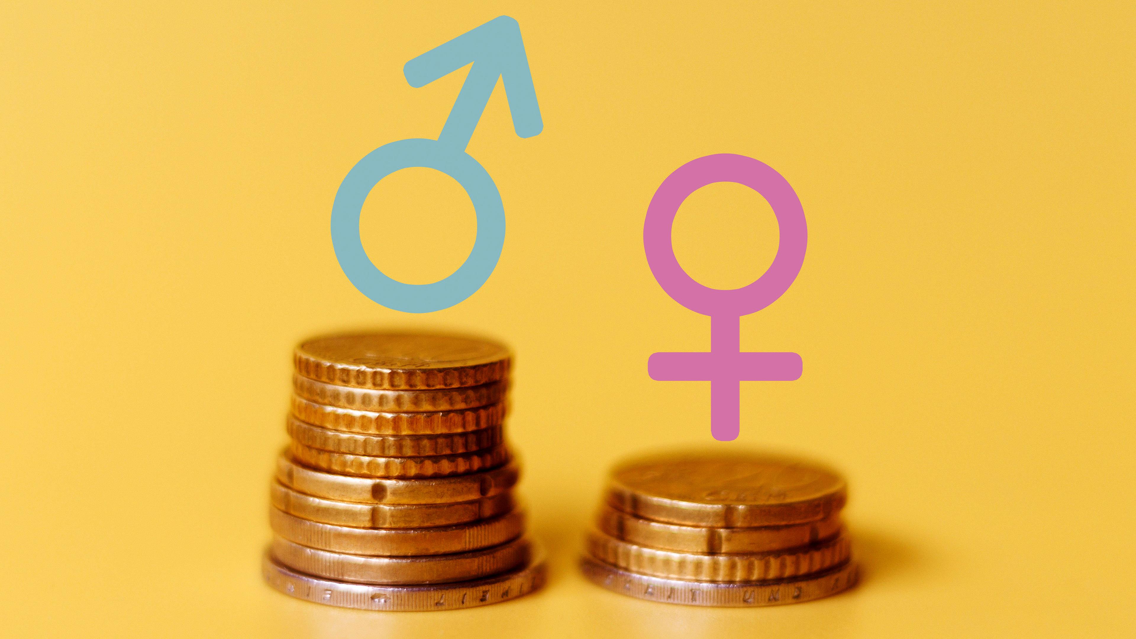 Symbolbild: Zwei unterschiedlich Stapel Euro-Münzen jeweils mit Symbold Mann bzsw. Frau auf gelbem Hintergrund