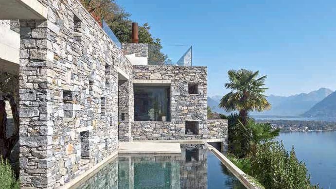 Zwar kein Unikat im Hinblick auf Ökologie, aber ebenfalls für die Ewigkeit gebaut ist ein Ferienhaus über dem Lago Maggiore: Entstanden aus einer Mischung aus recycelten alten Mauersteinen aus Abbruchgebäuden und neuem, regionalem Granit scheint es mit der umliegenden Felswand aus demselben Stein und dem üppig wuchernden Grün ringsum geradezu zu verschmelzen.