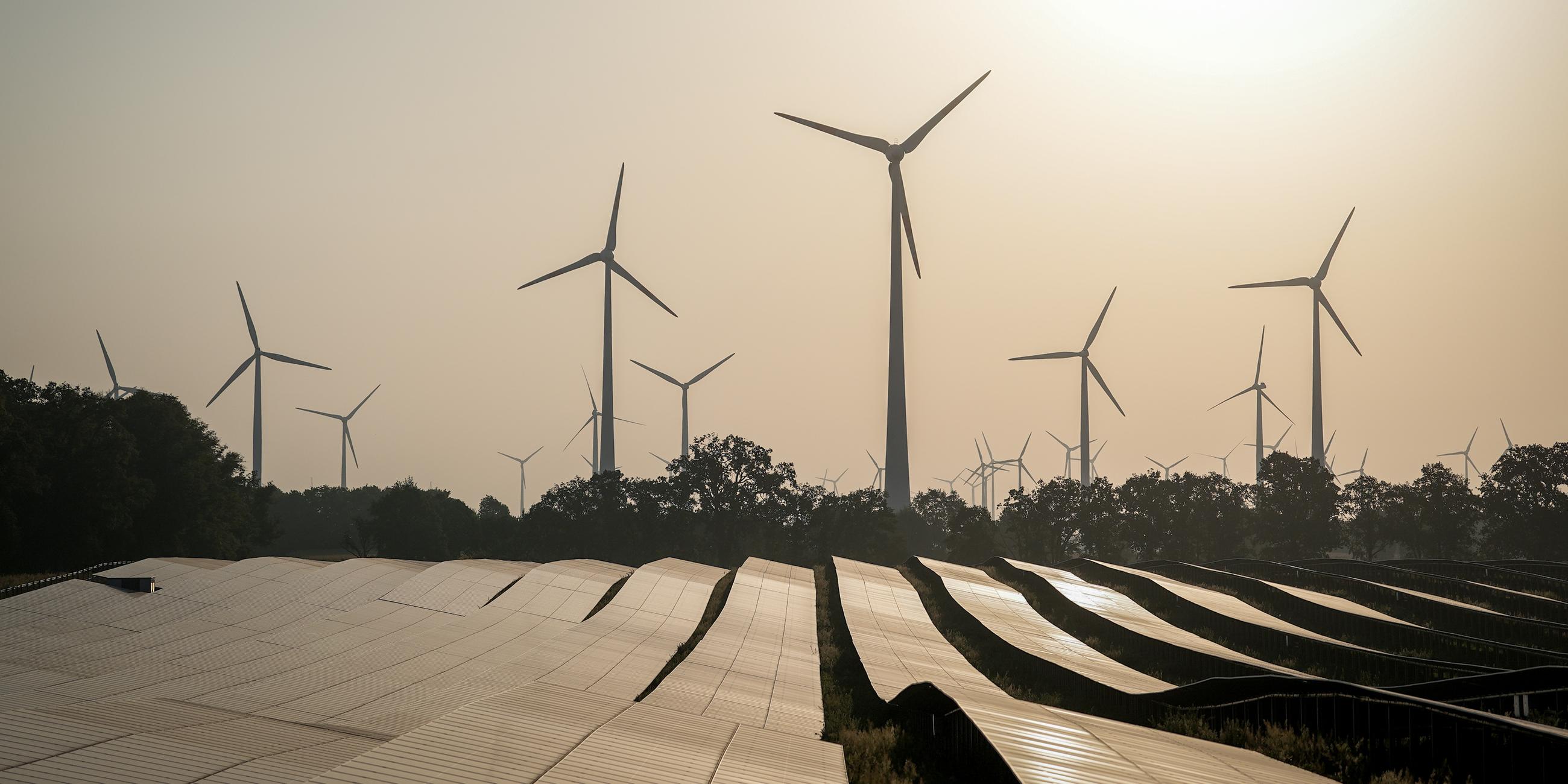 Erneuerbare Energien: Solarfeld reflektiert vor Windkraftanlagen die Sonnenstrahlen