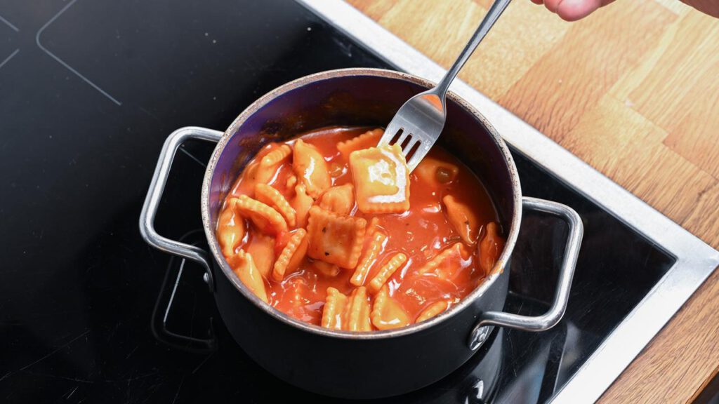 Ein Topf mit Ravioli aus der Dose steht auf einem Herd.