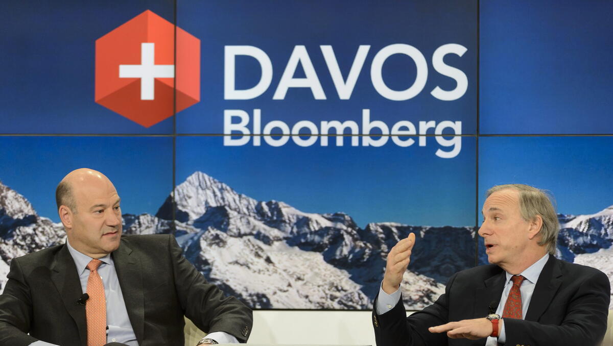 Ray Dalio (rechts), Gründer und Co-Chief Investment Officer von Bridgewater Associates, spricht neben Gary D. Cohn (links), Präsident und Chief Operating Officer des globalen Investmentbanking- und Wertpapierunternehmens Goldman Sachs, während einer Podiumsdiskussion auf der 45. Jahrestagung des Weltwirtschaftsforums (WEF) in Davos, Schweiz, am 22. Januar 2015. (Foto: dpa)