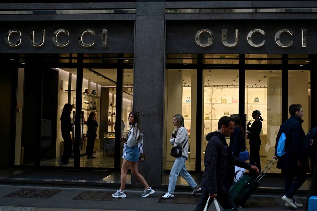 Menschen kommen an der Gucci-Boutique in der Via Monte Napoleone, Mailands berühmter Einkaufsstraße, vorbei. Bildnachweis: GABRIEL BOUYS/AFP