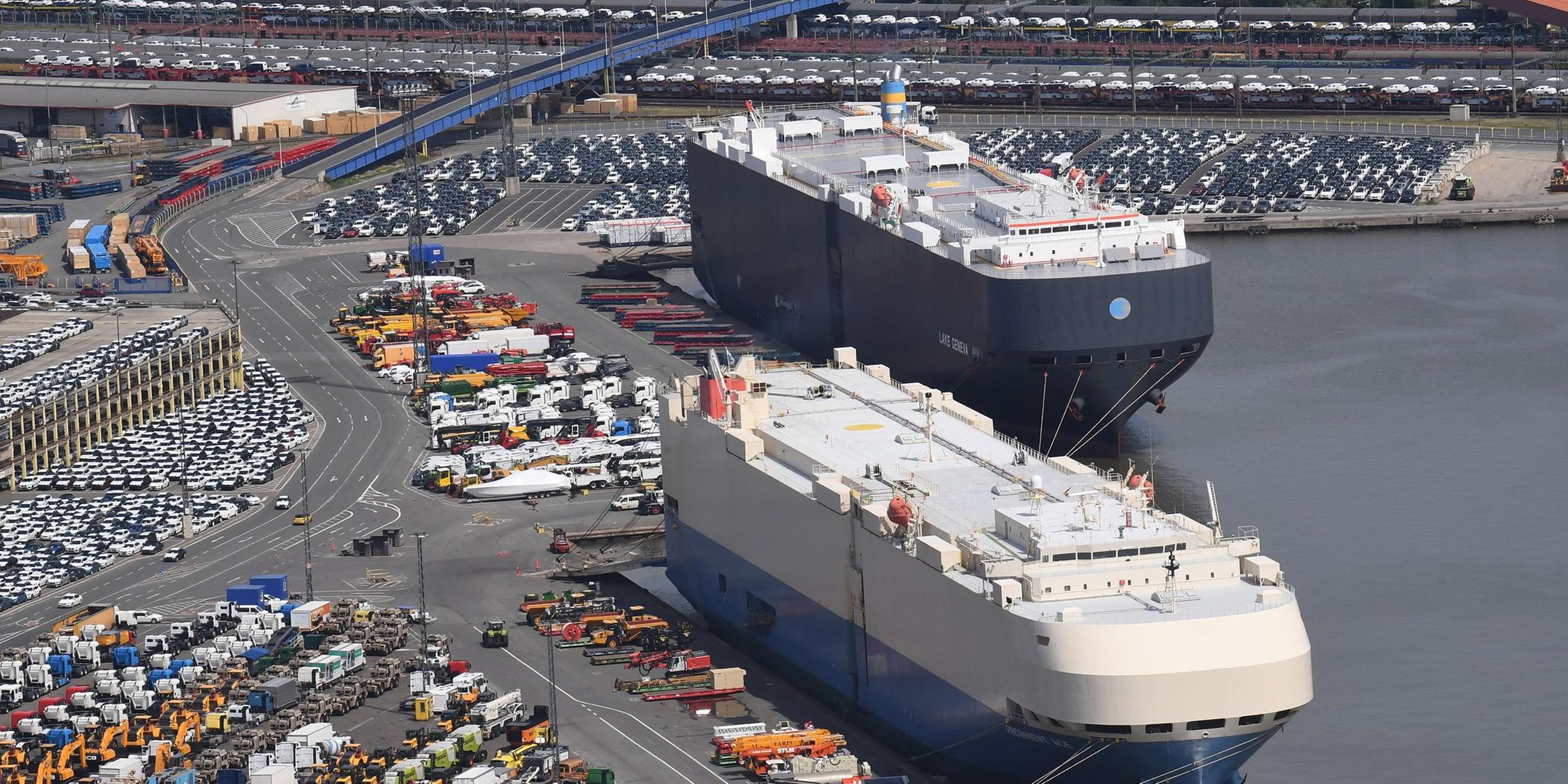 Bremen, Bremerhaven: Die Luftaufnahme zeigt Autotransporter die im Hafen am Autoterminal liegen.